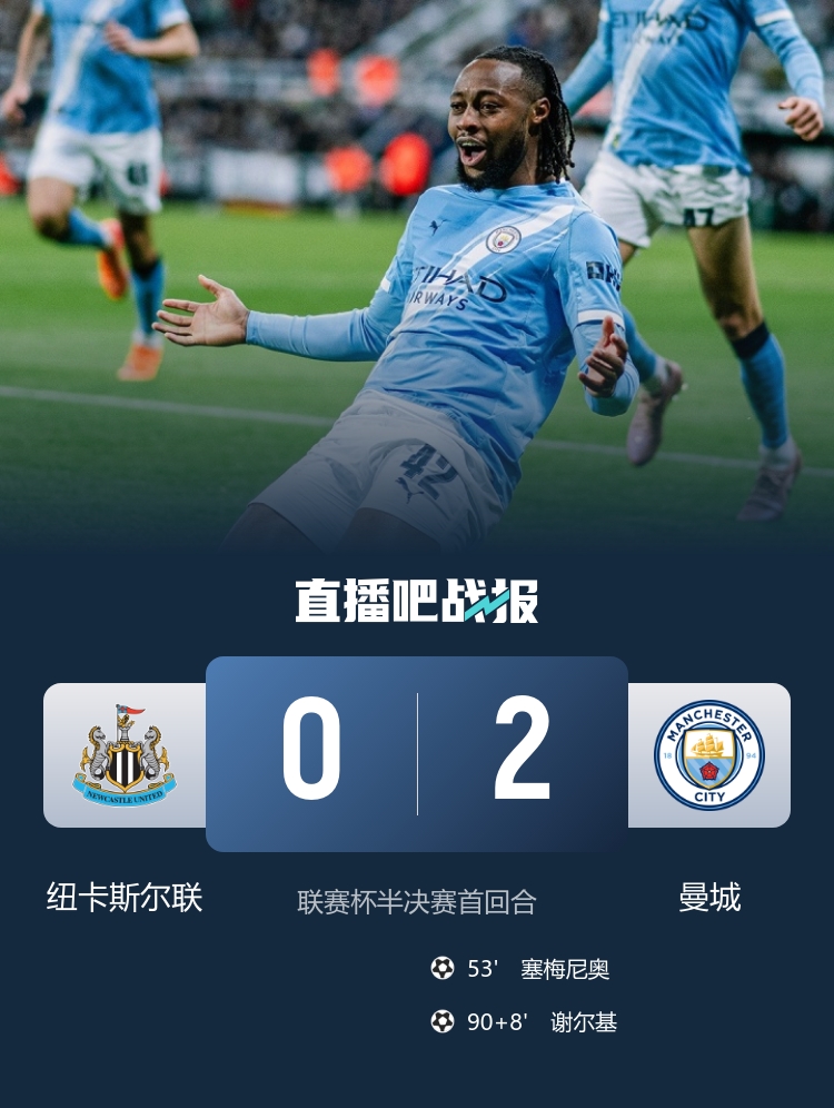 联赛杯半决赛首回合,曼城2-0纽卡斯尔联,塞梅尼奥2场2球,谢尔基建功。
