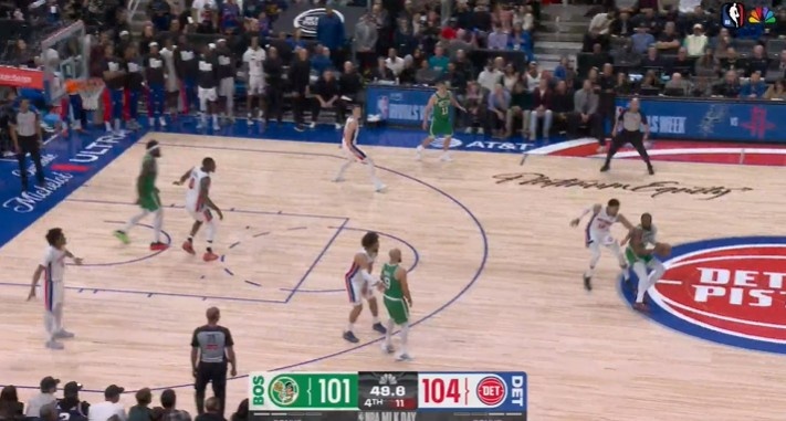 比赛最后49秒,杰伦·布朗在转身启动运球时抬起并重新落下了他的中枢脚,此为走步违例漏吹。
