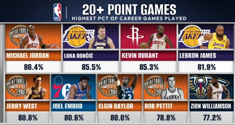 开云体育app-历史20+场数占比:乔丹86.4%第1 东契奇2KD3詹姆斯4恩比德6锡安9